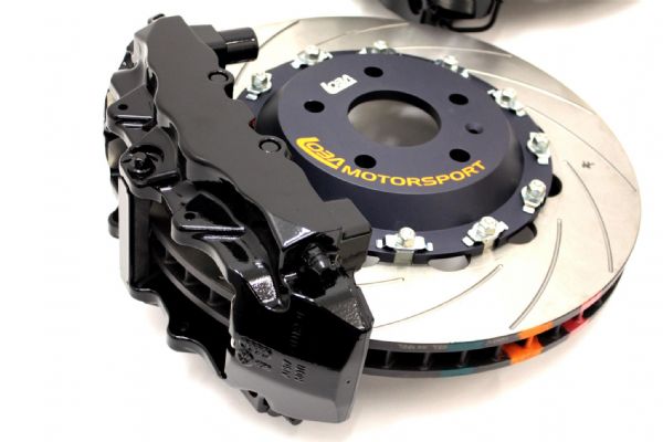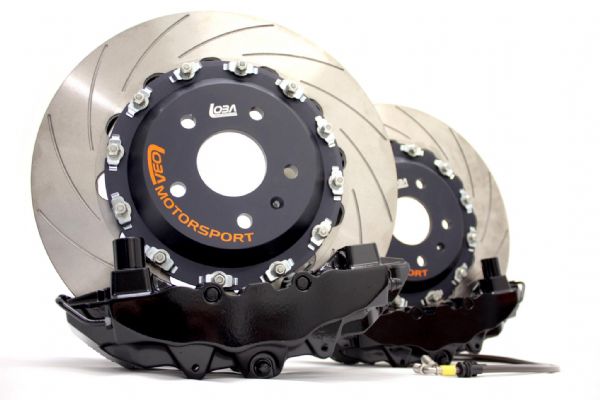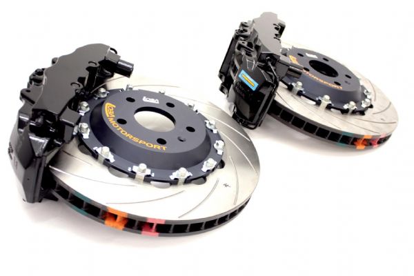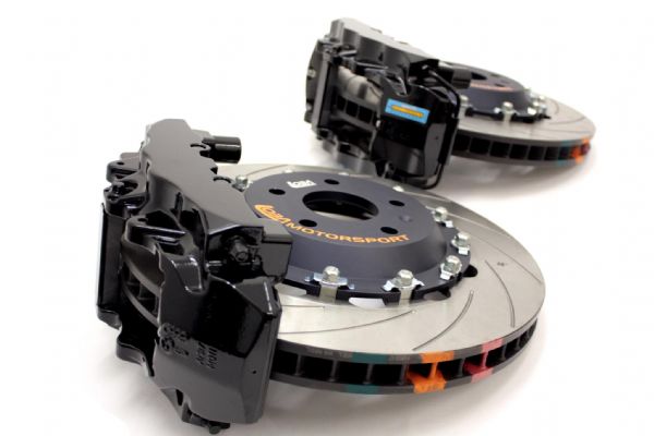 Uses a pair of supplied Brembo 8 pot calipers (Black), the assembly uses “Float in the Bell” Technology, float is limited to 0.2mm compared to 0.5-0.7mm float disc systems such as Alcon or less capable AP racing setups. Custom rate developed bobbin springs allow design axial and radial float whilst maintaining OEM levels of NVH.