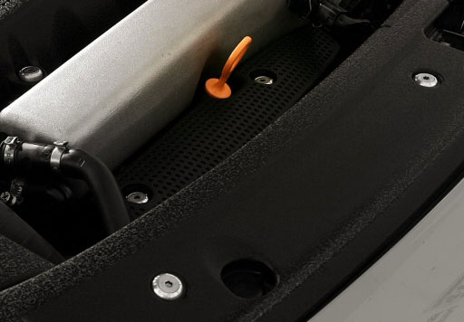 The coolant bottle and battery cover hardware is replaced with a washer machined to the correct height and a stainless steel M6 flat head bolt. The plastic upper engine cover fasteners are replaced with the same washers and bolts, but bolt down to a solid CNC machined bracket. The lower engine cover screws, hidden deep down in the OEM recesses are replaced with tall washers and extra long bolts. No longer will these two fasteners be soaked in crud. The front fascia clips are replaced with a similar washer and bolt combination, however the core support offers no threads for easy attachment. Six CNC machined brackets rivet behind the fiber core support providing a solid mounting point for all six fasteners. Extra thin washers and shorter bolts ensure the hood will close without contacting the hardware.